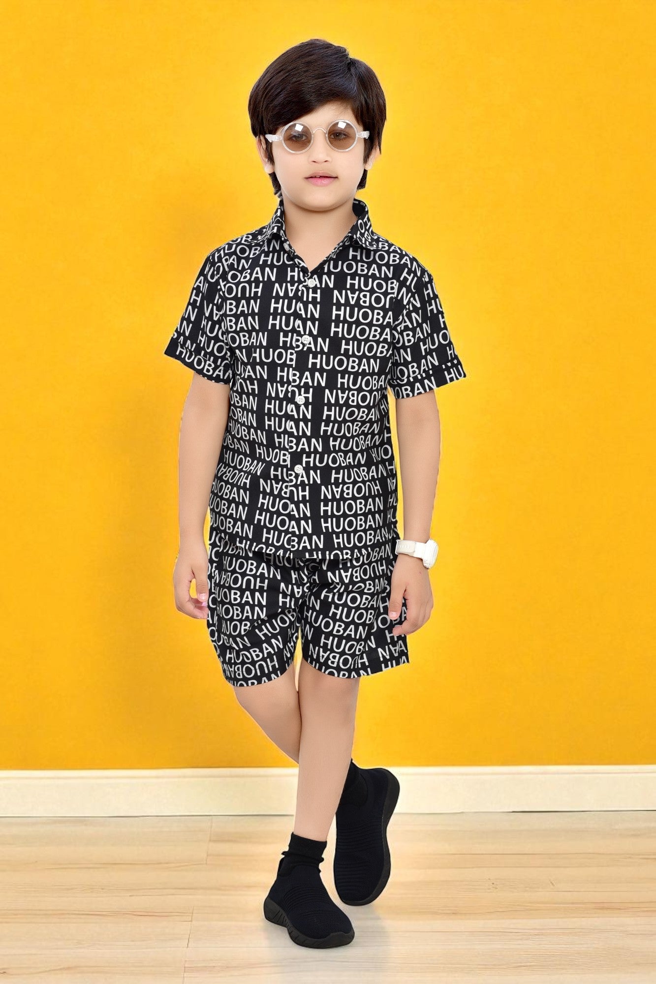 Stylish Black Text Printed Cotton Boys Co-Ord Set